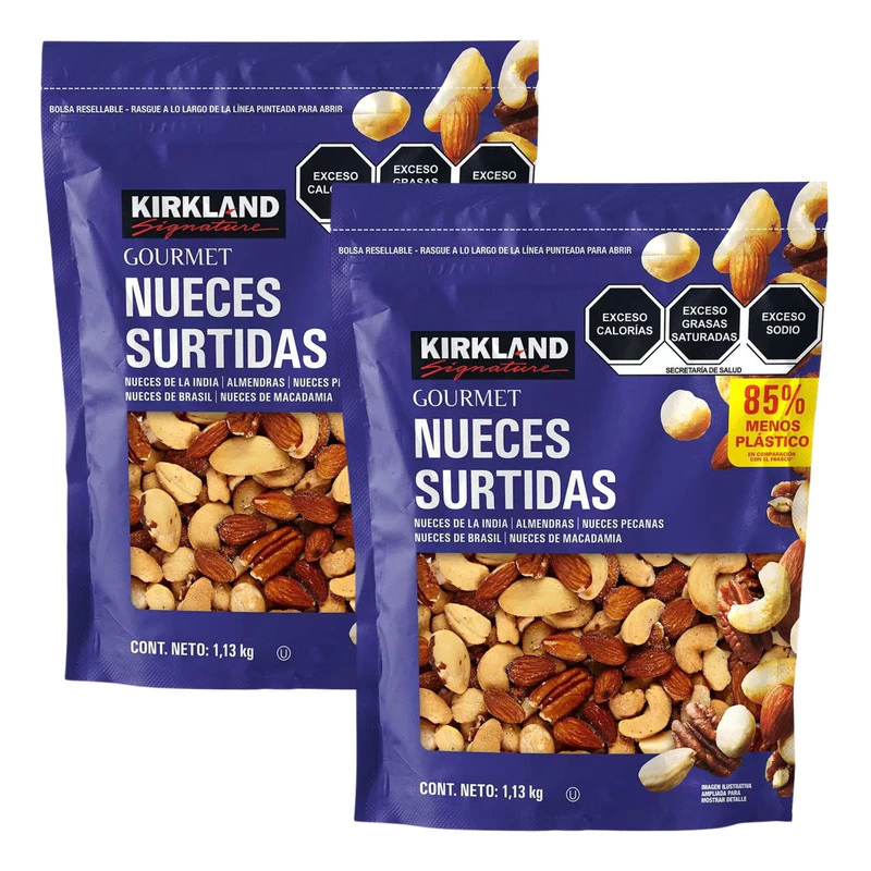 Las nueces surtidas son un producto de lujo de la marca Kirkland Signature. Es una mezcla de deliciosas y nutricionales nueces, almendras y nueces pecanas. Son fuente de proteína, fibra y nutrientes esenciales.