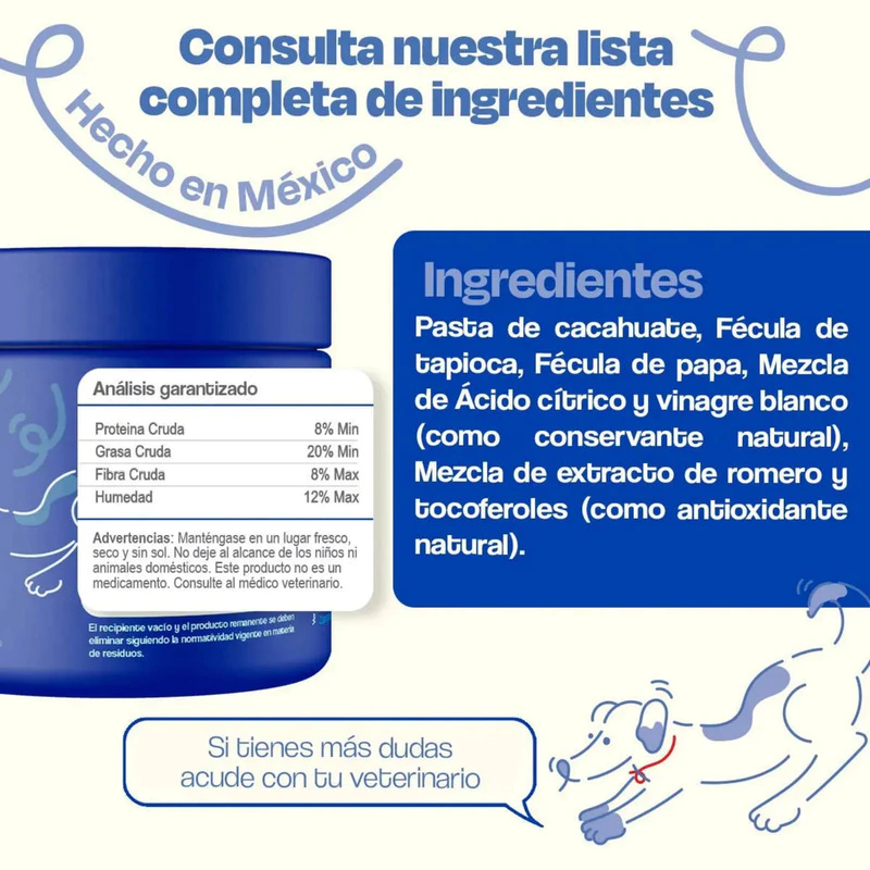 ¿Por qué no usar Crema de Maní regular? Con una fórmula hecha exclusivamente para perros mezclando crema de maní con harina de tapioca, será mucho más fácil envolver las pastillas