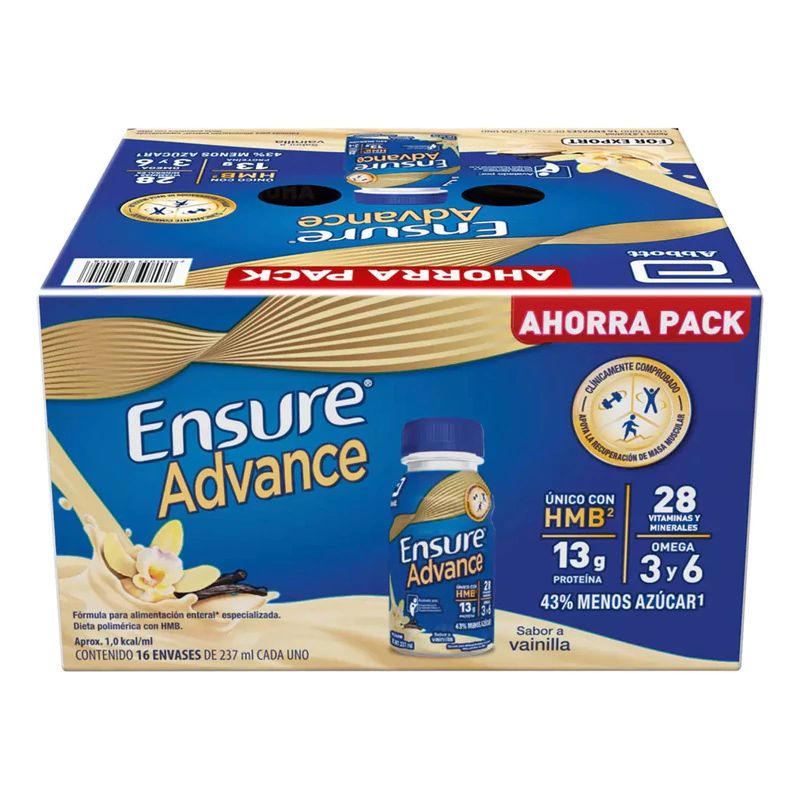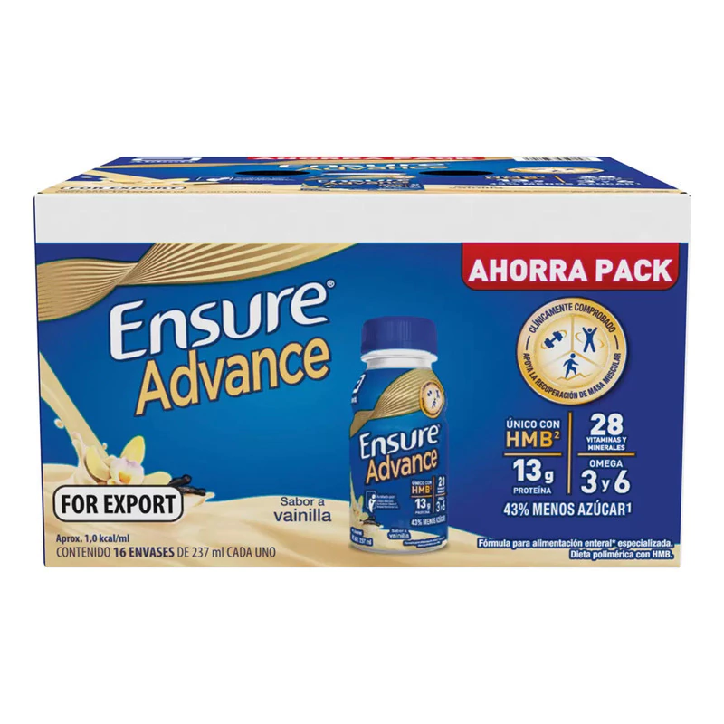 Suplemento alimenticio para adultos sabor vainilla. Fórmula única con HMB*, que te ayuda a mantener y recuperar tu masa muscular. Ensure Advance contiene 28 vitaminas y minerales, 13g de proteína y es el único con HMB que mantiene la proteína de tus músculos para evitar su pérdida