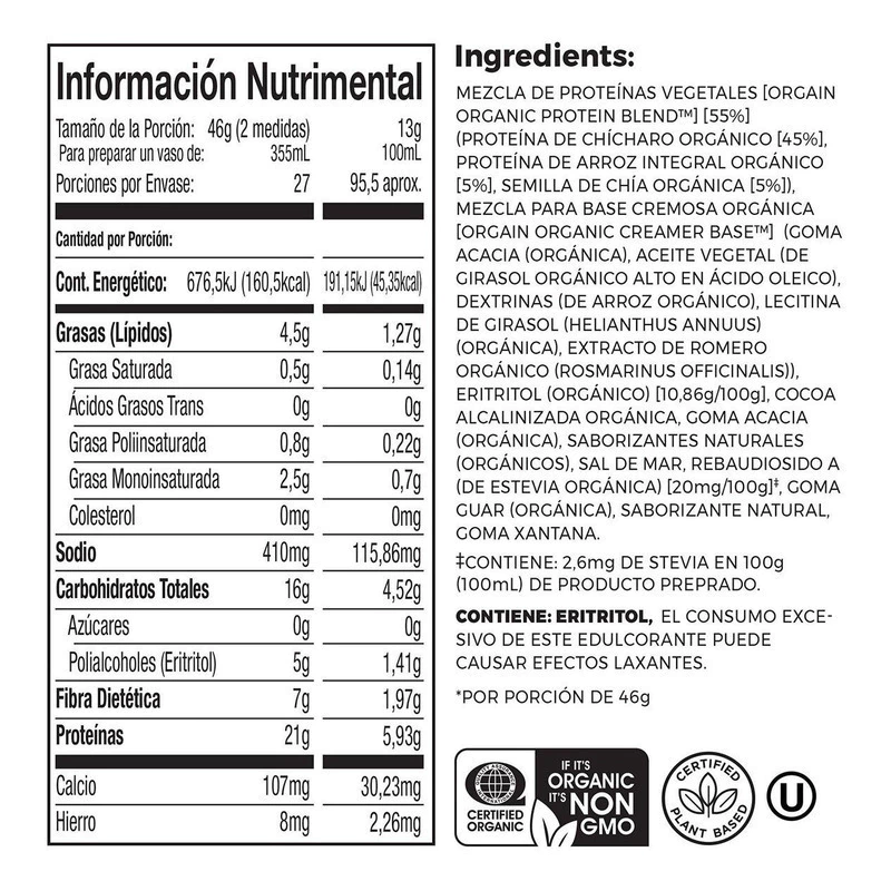 - Ingredientes: Fibra orgánica,Proteína de chía orgánica.,Proteína de germinado de arroz integral orgánico